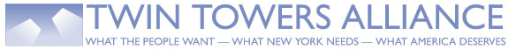 TWIN TOWERS ALLIANCE CALLS FOR NEW START AT GROUND ZEROFOR IMMEDIATE RELEASE May 22, 2006 A coalition of groups seeking rebuilt Twin Towers today called on New York's leaders to "cut the thread" by which construction plans for Ground Zero are hanging and start over with a more coherent plan and guidance from developer Donald Trump. "The Twin Towers Alliance urges New York's leaders to cut that thread now and start over. It's not too late to do the right thing and do the thing right," said Alliance spokeswoman Margaret Donovan. Donovan was referring to a comment made last Thursday by State Assemblyman Richard Brodsky, following a hearing looking into performance and accountability at Ground Zero. Brodsky, who chaired the committee, told reporters afterward that the current WTC plans were "hanging by a thread." The Alliance believes Governor Pataki can and should take steps to disband the dysfunctional Lower Manhattan Development Corporation (LMDC) and move to rebuild the Towers, even enlisting the know-how of Donald Trump to make up for lost time. "Trump's legendary can-do, will-do spirit would be the perfect antidote to the current moribund state of affairs. We hear from the public all the time calling for him to step in," she added. Donovan said starting over was justified not only because current plans for the Freedom Tower and 9/11 memorial are "uninspired and second-rate," but because "the people have been excluded from the LMDC proceedings from day one and comprise the only group that hasn't qualified for special-interest status. It's as if we were invited out to dinner, not allowed to eat, and then presented with the check for everyone else. The entire process has been conducted in a dismissive, upside-down fashion. "Poll after poll has shown that most New Yorkers and most Americans think that the Towers should be rebuilt," Donovan stressed. "New Twin Towers would be powerfully appealing, while the current hybrid plan is so undistinguished that it cannot possibly draw the prestigious tenants needed to make it economically viable. And the wasteful shuffling of government offices to boost Freedom Tower occupancy is bad policy." She underscored that lack of interest on the part of the private sector is directly related to the lackluster quality of the development and not to threats of future attacks. "New York City subway riders (and workers in other tall towers all over the country) live with a heightened sense of danger, but they do not allow the 'new normal' to warp their routine. Businesses know that." Donovan noted that by concentrating the 10 million square feet of office space back into new Twin Towers, much of Ground Zero would be freed up for other purposes. She further advocates addressing security concerns by scrapping plans to reintroduce the pre-WTC street grid. She noted that running the old streets through the site was contrived and never a legitimate concern of most New Yorkers. Applauding Mayor Bloomberg's recent suggestion to move the memorial into the lobby of the Freedom Tower, Donovan pointed out: "If 9/11 artifacts and tributes occupied the vast sunlit lobbies of restored Twin Towers instead of the dark, depressing tomb of the Freedom Tower's concrete bunker, it would far better honor the lives and sacrifices of those who died that day. We therefore urge Governor Pataki and other New York leaders to immediately set in motion plans to rebuild the Twin Towers. We all remember how desperate the times were that set us on the current course and fault no one. But now, almost five years later, it is not too late to keep a terrible tragedy from being compounded by a terrible mistake." # # #